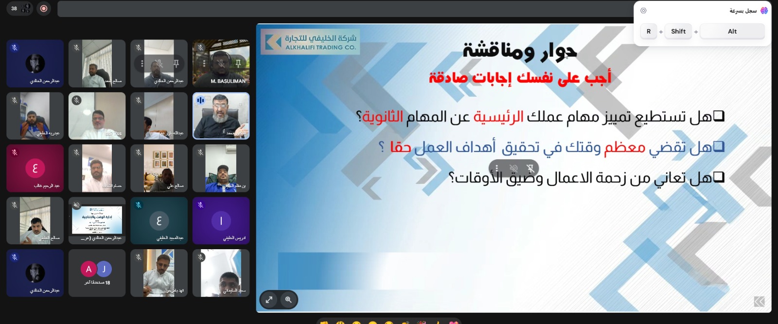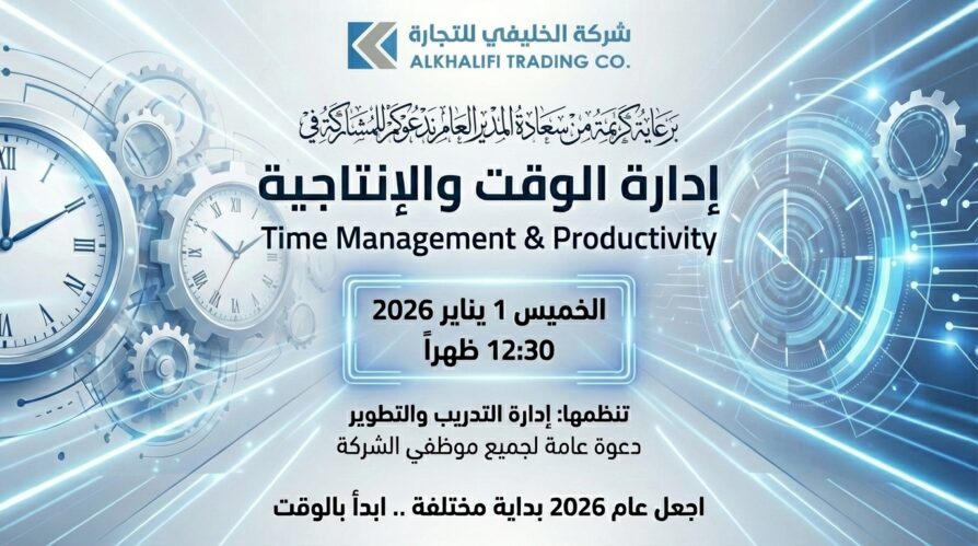 برعاية كريمة من سعادة المدير العام الأستاذ/ محمد حسين الخليفي، نظّمت شركة الخليفي للتجارة دورة تدريبية بعنوان «مهارات إدارة الوقت والإنتاجية»، وذلك يوم الخميس 1 يناير 2026م، ضمن برامجها الهادفة إلى تطوير الكفاءات الوظيفية.