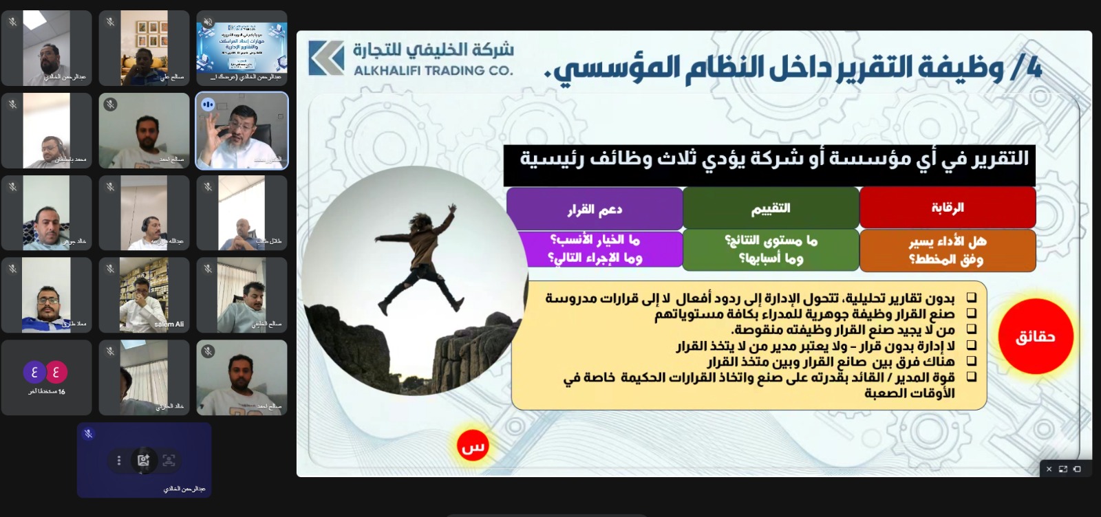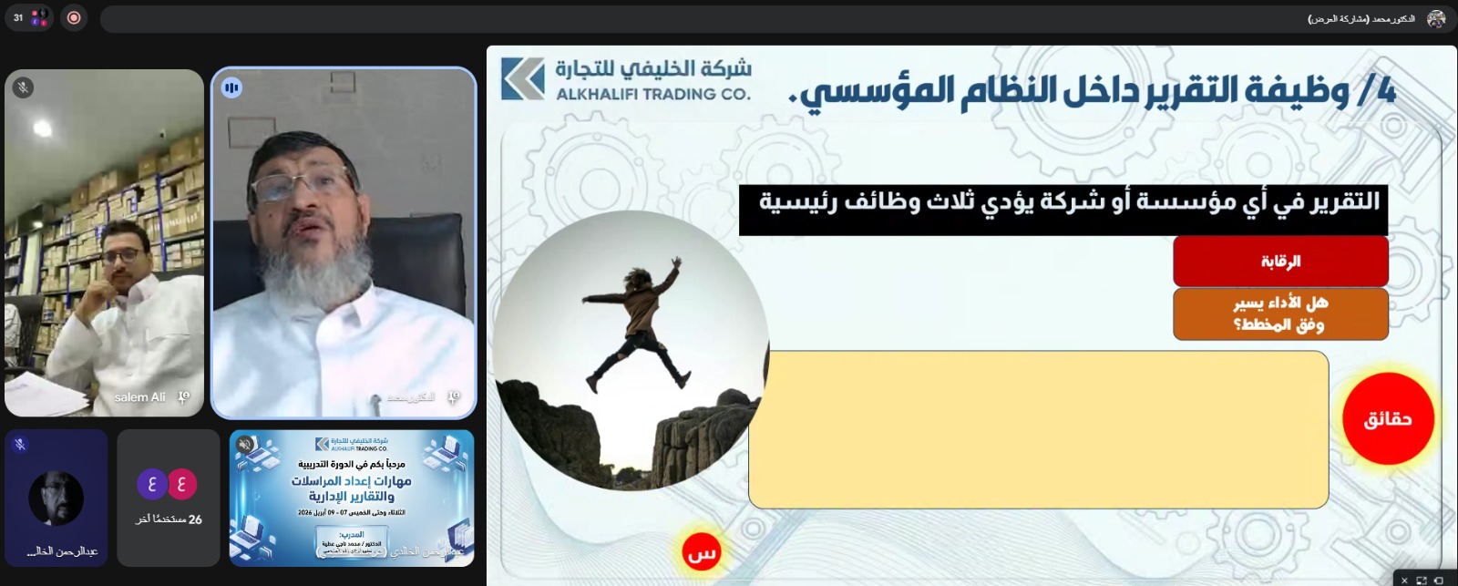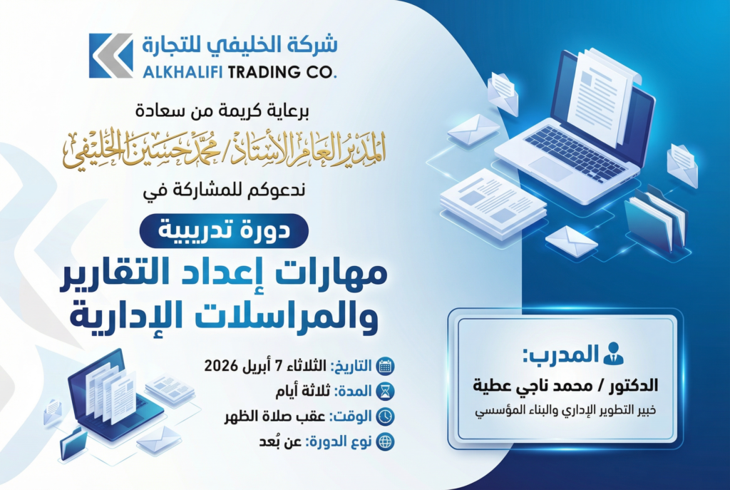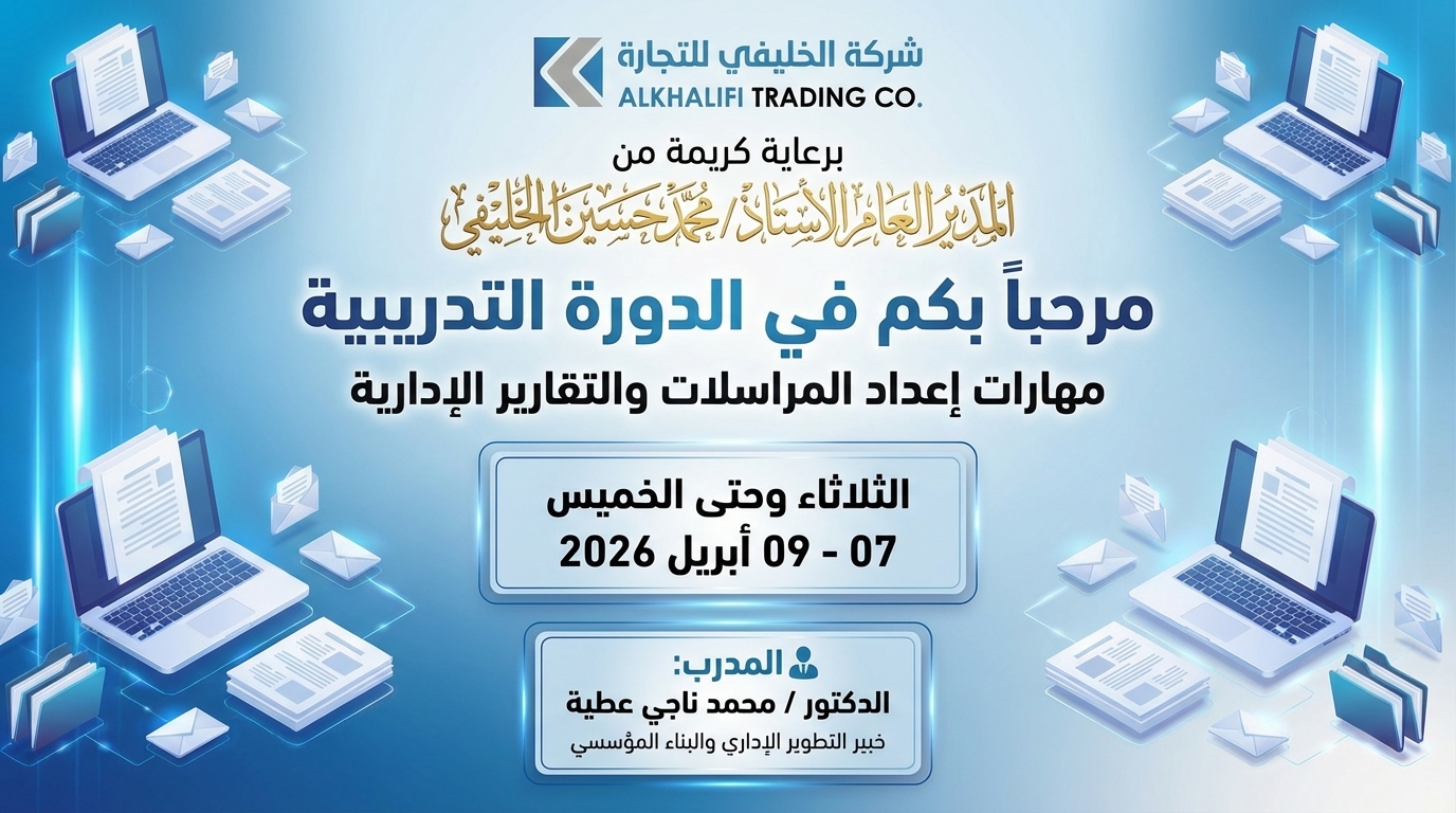 في إطار مسيرتها المتواصلة نحو بناء كوادر بشرية مؤهلة وترسيخ منظومة عمل إدارية محكمة، نظّمت شركة الخليفي للتجارة دورة تدريبية متخصصة امتدت على مدى ثلاثة أيام متتالية، من الثلاثاء إلى الخميس من شهر أبريل 2026م، تحت عنوان “مهارات إدارة المراسلات والتقارير الإدارية الاحترافية – حوكمة التقييم والمساءلة وجودة القرار”، وذلك في تطبيق عملي ملائم لبيئة الشركة وطبيعة أعمالها.